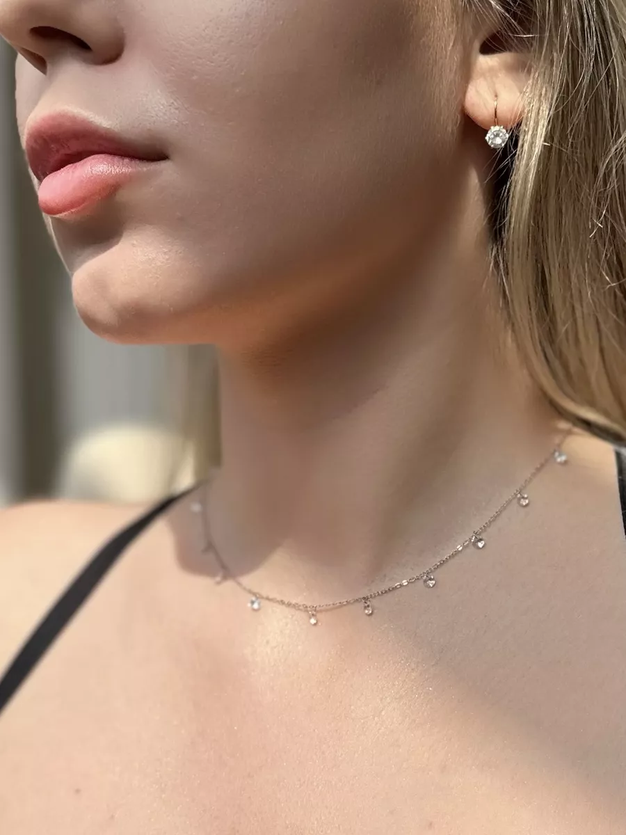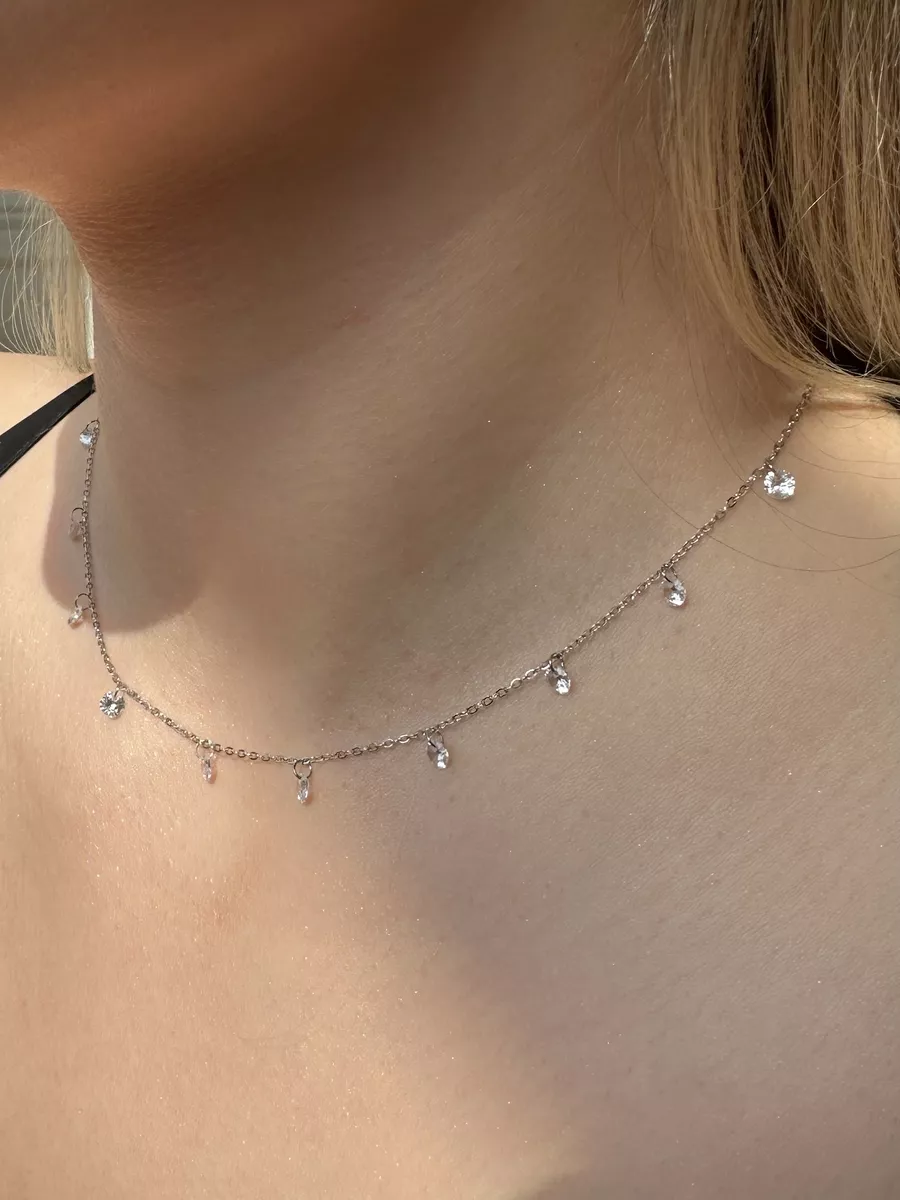 Изящное женское колье на шею. Выполнено в виде цепочки со свисающими круглыми кристаллами.